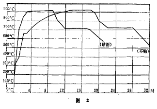 圖2為貼硅板和不貼硅板的爐溫曲線。 每燒一爐鑄鋼件可縮短十小時,每爐可節(jié)約煤氣6000m3(合標煤l250kg)。每立方米煤氣價0.025元,共計150元。每月生產(chǎn)按25爐計算,共可節(jié) 約煤氣十五萬立方米(合標煤31250kg)。一臺爐每月 可為國家節(jié)約煤氣費3750元。