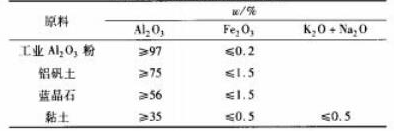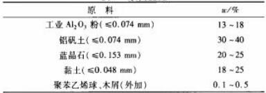 以工業(yè)Al2O3粉、粘土、燒結(jié)出色的鋁礬土和部分藍晶石為首要質(zhì)料,增加木屑(1mm挑選)和聚苯乙烯球(直徑2~0.5mm)制備輕質(zhì)磚。質(zhì)料化學(xué)組成見表1