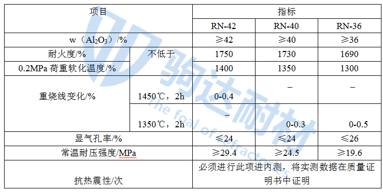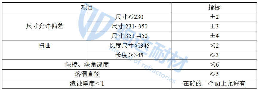 YB/T5107-1993將熱風爐用黏土質耐火磚按理化指標分為RN-42、RN-40、RN-36三種牌號。其理化指標、尺寸允許偏差及外觀見表1和表2。
