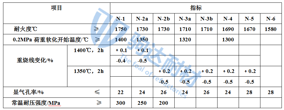 中國冶標(YB/T 5106 — 1993)將粘土質耐火磚按理化指標分為N-1、N-2a、N-2b、N-3a、N-3b、N-4、N-5、N-6八種牌號,其理化指標見表1所列。