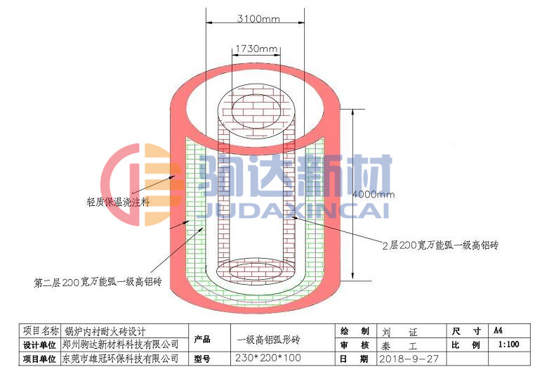 我公司是專業(yè)從事耐火材料的生產(chǎn)制造與窯爐的設(shè)計(jì)安裝工作,主要生產(chǎn)耐火磚有高鋁材質(zhì)、粘土材質(zhì)、剛玉材質(zhì)、碳化硅材質(zhì)和輕質(zhì)隔熱耐火磚等耐火材料,近期我公司收到東莞雄冠環(huán)?萍加邢薰,發(fā)來(lái)的30t熱解爐使用耐火材料的分布圖并希望能夠得到我公司在材料與設(shè)計(jì)安裝上的支持,收到相關(guān)資料后我公司設(shè)計(jì)安裝部門進(jìn)行了核對(duì),并繪制相關(guān)使用的萬(wàn)能弧耐火磚的設(shè)計(jì)砌筑方法。雄冠環(huán)保提供的熱解爐相關(guān)資料。