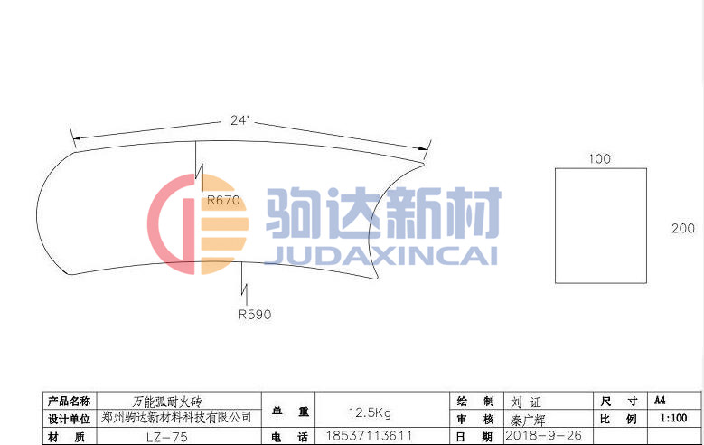 我公司根據(jù)相關(guān)資料設(shè)計(jì)內(nèi)襯耐火材料使用的磚型為萬(wàn)能弧耐火磚,改雙層壁厚為單層壁厚,萬(wàn)能弧耐火磚型尺寸定為280X200X100(mm),下圖(1)為我公司設(shè)計(jì)圖紙,砌筑方法為:外層緊貼爐殼為輕質(zhì)保溫澆注料體積密度為1.3g/cm³,內(nèi)層為萬(wàn)能弧耐火磚,單層砌筑每圈需要數(shù)量為39塊,下圖為設(shè)計(jì)方案(2)。