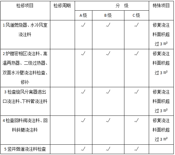 表1耐火耐磨保溫澆注料檢修項目